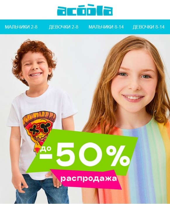 С 14 июня 2023 года (и до особого распоряжения об окончании акции) при покупке в сети магазинов Акула, или заказе из каталога на сайте интернет-магазина acoolakids.ru модных моделей для девочек и мальчиков от 2 до 14 лет из выделенного ассортимента коллекций сезонов Весна-Лето 2023 года предоставляются скидки до 50%.