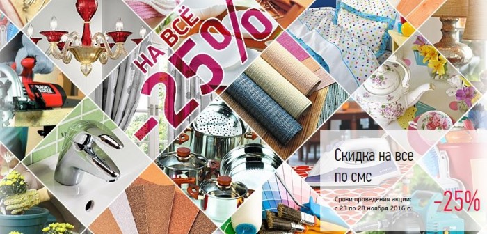 С 23 по 28 ноября 2016 г. в сети гипермаркетов «Домовой» в г. Санкт-Петербурге проводится уникальная акция: скидка 25% на ВЕСЬ ассортимент товаров для участников смс-рассылки*.