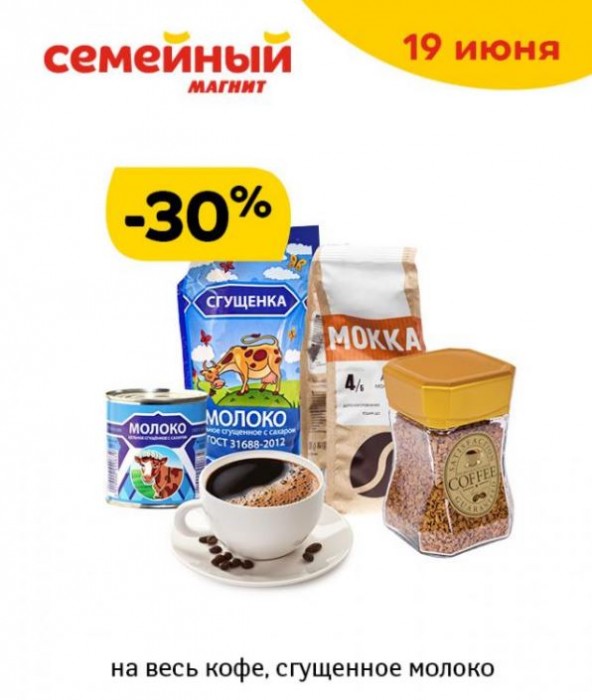Только один день, 19 июня 2018 года в сети магазинов Магнит предоставляется скидка 30% на следующие товары: